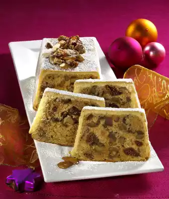 For the filling, roughly cut dates and figs and soak in Armagnac. Coarsely chop the walnuts and mix with the honey. Beat 100 g butter and 50 g sugar until fluffy. Stir in almonds, vanilla pulp, cloves and cinnamon. Add 6 egg yolks and beat everything until light and frothy. Fold in fruits and nuts. Beat the egg whites until stiff, adding 100 g sugar and 1 pinch of salt. Fold 1/3 of the egg whites into the egg-fat mixture. Sift 50 g flour over it and mix everything. Carefully fold in the remaining beaten egg white. Fill the mixture into the box form and smooth it down. Bake in the preheated oven (electric cooker: 175 °C/ convection oven: 150 °C/ gas: level 2) for about 1 hour.