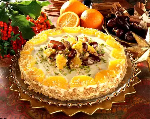 Place second shelf on top. Spread the remaining cream all around the cake. Sprinkle the edge of the cake with remaining walnuts (keep one tablespoon). Decorate the cake surface with oranges, dates, walnuts and pistachios.