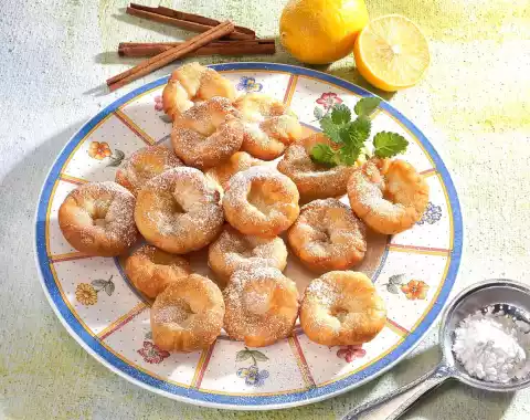Heat clarified butter. Fry and turn the particles first with the pulled out top side down. Drain on kitchen paper. Mix sugar and cinnamon. Fry the particles while still warm. Dust with icing sugar just before serving.