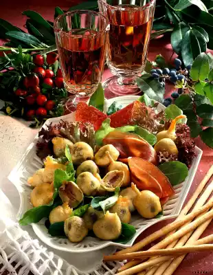 Heat frying fat. Pull olives through the dough and fry until golden brown. Drain on kitchen paper. Arrange fried olives, ham and salami on salad leaves