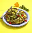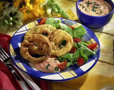 Peel onion and cut into rings. Dip the onion rings one after the other into the dough, let them drip off a little and fry them in hot fat until golden brown. Let it drip off on kitchen paper. Mix tomatoes and salad with the marinade. Serve with the onion rings. Add some sauce. Add the rest of the sauce extra