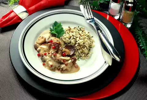 Fry the onions and mushrooms in the dripping. Add stock and cream, bring to the boil and stir in the sauce thickener. Add meat and cranberries. Season to taste with salt and pepper. Arrange rice and shredded meat.