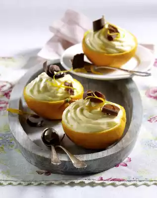 Pour cream into a piping bag with a large perforated spout and squirt into the orange halves. Cover and chill for approx. 1 hour. Decorate with chocolate rolls and orange strips.