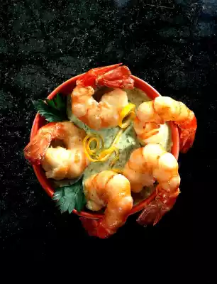 Season to taste with salt, pepper and lemon juice. Serve the scampi and dip garnished with lemon and parsley.