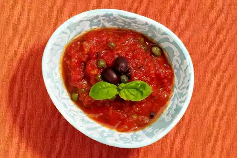 Chop the olives finely. Add olives and capers to the sauce. Season the sauce with salt, pepper and sambal oelek. Serve the sauce warm or cold