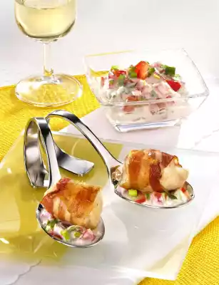 Wash the chicken filet, dab dry and cut into 12 small cubes. Halve the bacon slices and wrap half a slice around each meat cube. Heat oil in a pan and fry the chicken cubes for 4-5 minutes, turning them over. Season the meat with pepper (no salt is necessary). Arrange the chicken cubes with some sauce on the spoons and serve