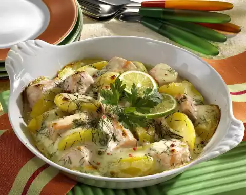 Bring to the boil while stirring continuously. Season to taste with salt, pepper and horseradish. Stir in dill. Fill potatoes and salmon cubes into a gratin dish. Spread the sauce on top. Bake in the preheated oven (electric: 225 °C/ gas: level 4) for about 12 minutes.