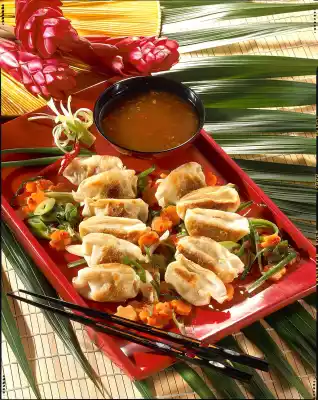 Add spring onions. Add sauce and 50 ml water and heat briefly. Heat the remaining oil in a frying pan. Fry dim sum in it for 3-4 minutes until golden brown. Pour on 3 tablespoons of water and cover and let it simmer.