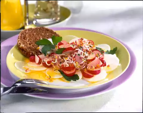 Mix vinegar, salt, pepper, oil and parsley. Cut radish into slices, quarter radishes. Mix both with sprouts and marinade. Eat bread with them