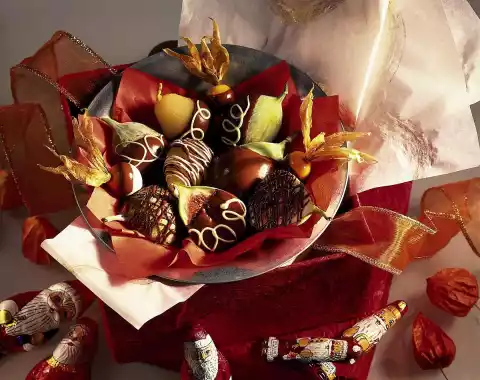 bend outwards. Dip the prepared fruit into the dark chocolate coating and allow to dry. Pour white couverture into the freezer bag. Cut off a small corner. Decorate the dried fruits as you like. The fruits can be kept in the refrigerator for 2-3 days.