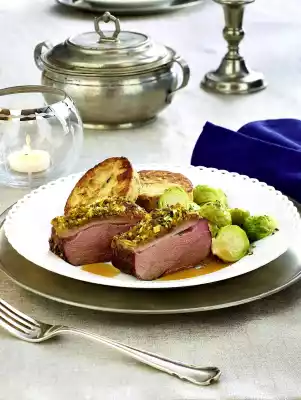Heat 1 tablespoon of oil in a large frying pan. Fry the dumpling slices in it in 2 portions on each side until brown, take them out. Cut goose breast into slices and arrange on plates with dumpling slices, Brussels sprouts and sauce.