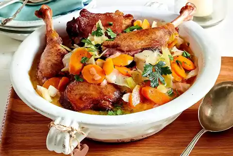 TIP - Wide pot: Place the roasted legs side by side on the vegetables with the skin side up. This way the roast aromas are retained even after cooking.