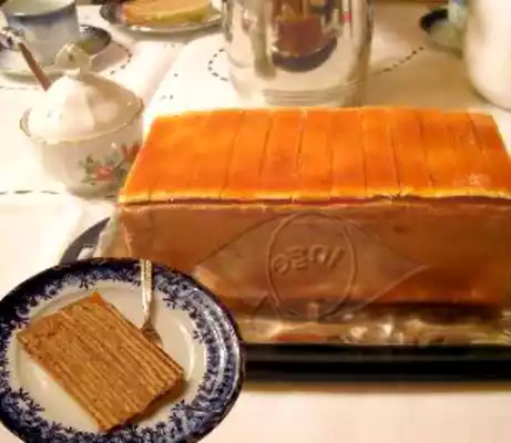 Cream egg yolk with three quarters of the sugar and add flour. Beat egg white with water and the remaining sugar until stiff and fold in. Grease baking trays and dust with flour. Spread three thin layers of 35 x 30 cm of the dough on the baking trays and bake in a preheated oven at 200° for 6 - 8 minutes.