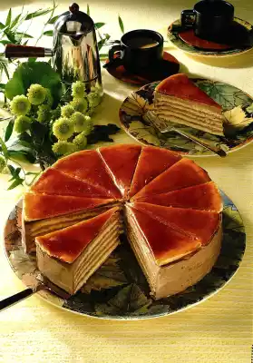 Pull a long knife through a piece of butter and quickly cut the base into twelve to 16 pieces. Before each cut pull the knife through the butter again. Lift the caramel base piece by piece onto the finished cake.