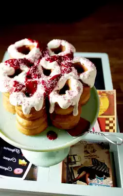 Stir 2/3 of the raspberry pulp loosely into the cream cheese mixture. Pour the mixture into a piping bag with a "Berliner" nozzle. Make 4 small punctures in 28 donuts with a sharp knife on the bottom side and fill each donut with the raspberry mixture.