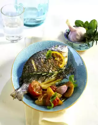 Wash the fish and dab dry. Scratch skin several times. Wash herbs. Place 1 clove of garlic, 1 sprig of rosemary and 1 stalk of basil in each fish's abdominal cavity. Place the giltheads and lemon slices on a baking tray lined with baking paper.