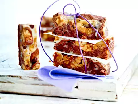 Grease square springform pan (24 x 24 cm; alternatively round, 26 cm Ø). Preheat oven (electric cooker: 175 °C/circulating air: 150 °C/gas: see manufacturer). Cut chocolate bars into slices approx. 1⁄2 cm thick.