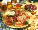 Put lamb, peppers, tomatoes and bay leaf alternately on skewers. Skewer the whole fillets lengthwise. Sprinkle with lemon juice and season with salt and pepper. Spread sage leaves on top. Drizzle all skewers with tomato oil. Puree peaches for the dips. Mix with chilli sauce and honey. Chop the pineapple finely, wash the coriander, chop it too and stir into the sauce. Clean and wash spring onions, cut into fine rings. Mix with ketchup, season with curry.