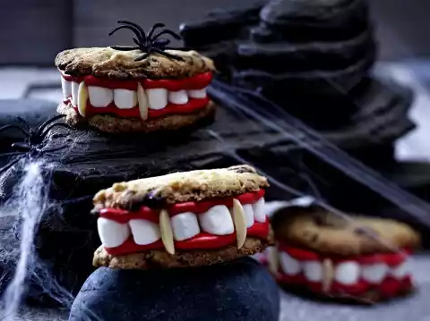 Coat the top of one cookie half with icing. Apply a thick layer of the glaze right up to the edge. For the teeth, place the marshmallows close together on the glaze. Spread the other half of the cookie on the underside with the icing as well and place it on the marshmallows.
