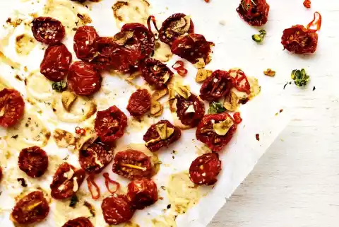 Wash the thyme, shake dry, remove the leaves. Peel garlic and cut into slices. Wash the pepperoni and cut into rings with the seeds. After about 2 hours drying time, sprinkle around the tomatoes and continue drying until the tomatoes have visibly shrunk and the juice has evaporated.