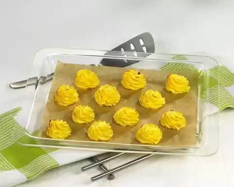 Line a baking tray with baking paper. Spray 12 duchess potatoes on it. Whisk 1 egg yolk with 2 tablespoons of milk and carefully brush the duchess potatoes with it. Bake in the preheated oven (electric cooker: 200 °C/ convection oven: 175 °C/ gas: level 3) for approx. 8 minutes