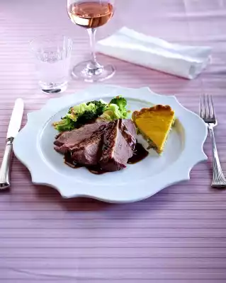 Season to taste with salt and pepper. Arrange tart, duck breast and sauce on plates. Serve with broccoli and flaked almonds.
