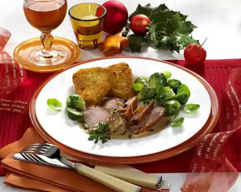 Add the sauce thickener while stirring, bring to the boil again briefly. Season to taste with salt and pepper. Drain the Brussels sprouts, toss briefly with fat and nutmeg. Cut duck breast into slices and arrange on plates with cognac-pepper cream sauce, Brussels sprouts and roasting wedges.