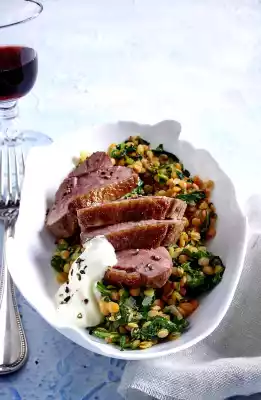 Cut the duck into slices. Arrange herb lentils and meat. Yoghurt tastes good with it.