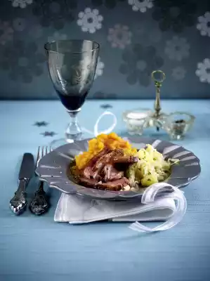 2-3 minutes before the end of the cooking time, brush the meat with honey on the skin side. Remove the meat, wrap it in aluminium foil and let it rest for about 5 minutes in a warm place. Drain the finished potatoes, collect the cooking water, measure approx. 125 ml, add to the potatoes again.