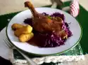 Let duck breast rest for a short time. Drain the potatoes. Mix potatoes, onion, cranberries, whole nuts and marinade. Cut the duck breast open, arrange with lamb's lettuce and nut vinaigrette. Served with baguette