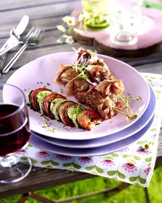 Cut the ham into strips about 1.5 cm wide. Heat 1 tablespoon of oil in a frying pan. Fry the diced duck for 2-3 minutes and remove. Place the diced meat and ham alternately on the skewers. Place the skewers on the tray next to the vegetables approx. 5 minutes before the end of the cooking time