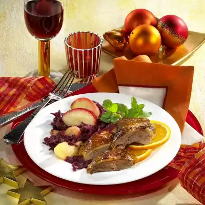 Add marjoram, bay leaf and cloves and fry briefly. Add red cabbage, deglaze with apple juice and braise for about 15 minutes. In the meantime wash apples, peel if necessary, quarter them and cut them into slices. After half the cooking time add the apples to the red cabbage. Season duck breast with salt and pepper, remove from the pan and keep warm. Deglaze the roast with chicken stock, orange juice and cream. Bring to the boil, stir in the sauce thickener, bring to the boil again and season to taste with salt, pepper and sugar. Cut open duck breast. Put some sauce on the plates, arrange red cabbage and duck breast on top.