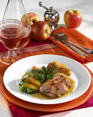 Season to taste with salt and pepper. Fill plenty of savoy cabbage strips into the large leaves, forming them into round shapes. Fry briefly in cabbage fat again. Cut open the duck breast and arrange with the cabbage balls on strips in the sauce.