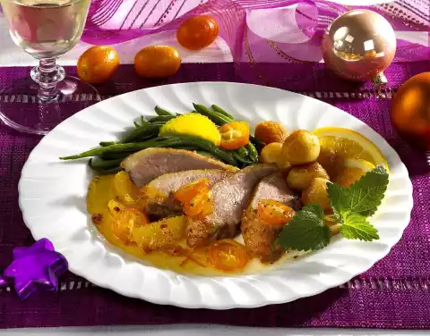 Add bowl and kumquats, bring to the boil briefly. Stir the starch and a little water until smooth and thicken the sauce. Bring to the boil briefly, heat up the orange filets in it. Season with salt, pepper and liqueur. Cut the duck breast open and serve with some sauce, beans and potato balls.