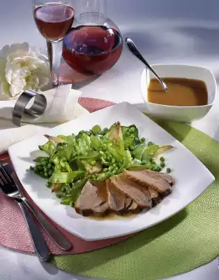Clean and wash the mangetouts. Remove the outer leaves from the lettuce. Wash and chop the lettuce. Cook peas and sugar snap peas in boiling salted water for about 7 minutes and drain. In the meantime peel and halve the shallots. Heat the fat in a saucepan. Sauté the shallots in it. Add the vegetables and fold in the salad, keep warm. Remove the duck breasts. Drain the fat. Deglaze roast stock with brandy. Add 3/8 litres of water and chicken soup and bring to the boil.