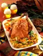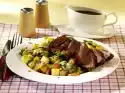 Meanwhile drain the Brussels sprouts and carrots. Heat the fat and fry the remaining shallot in it. Pour over the sprouts. Brown the almonds without fat and sprinkle over the vegetables. Arrange everything and garnish with marjoram