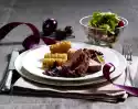 In the meantime peel the shallots and dice them finely. Remove duck breast and keep warm. If necessary, drain off any cooking fat except for a small residue. Sauté 2/3 of the shallots in the cooking fat. Add green pepper, wine and stock and bring to the boil. Stir in sauce thickener, bring to the boil again. Season to taste with salt and pepper