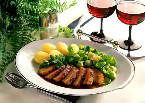 Cut the duck breast open, serve with sauce and sprouts. Melt the fat on top and sprinkle nutmeg over it. Garnish with parsley. Boiled potatoes taste good with it.