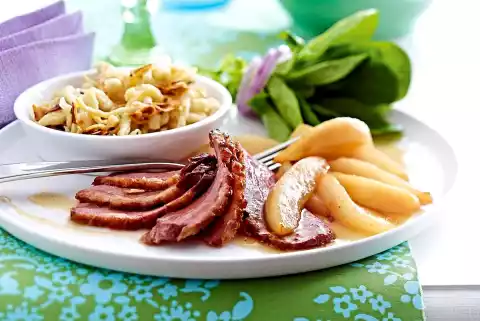 Stir starch and 2 tablespoons of water until smooth. Stir into the quinces, bring to the boil again and simmer for about 3 minutes. Season to taste with salt and pepper. Cut the fillets into slices and arrange with the quinces. Goes well with spaetzle tossed in hazelnut butter.