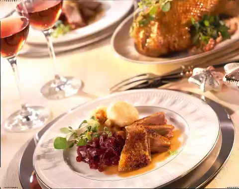 Season to taste with salt and pepper. Warm quince jelly slightly and stir with balsamic vinegar until smooth. Spread the duck with it and glaze it in the oven for about 5 minutes. Carve the duck, arrange on plates with red cabbage and dumplings and garnish with marjoram.