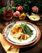 Add the remaining apricots, juice and tea water to the red cabbage. Cover and stew for about 1 hour. Then season again and thicken with sauce thickener. Carve the duck. Fill remaining apricots with cranberries. Arrange red cabbage, duck and filled apricots on a plate. Garnish with parsley and browned almond flakes. Serve with potato dumplings