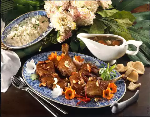 thicken the sauce with it. Season with salt, pepper, soy sauce and sugar. Roast the cashew nuts in a dry pan until golden brown. Cut duck breast into thick slices and arrange on a plate with the legs and nuts.