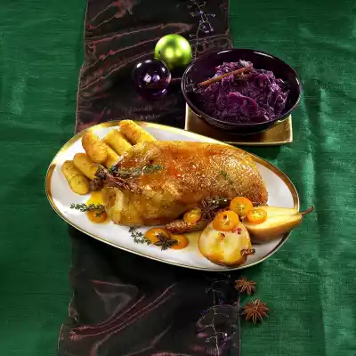 Fry the onion strips and red cabbage in it. Season with salt, pepper, sugar and bay leaf. Remove the spice bag from the hay. Pour the infusion and vinegar over the red cabbage and cook for about 1 hour. Stir in apple sauce, season again. Heat oil in a pan. Cook the croquettes in it at medium heat while turning for 15-20 minutes. Wash and halve the pears 1/4 hour before the end of the frying time. Cut kumquats into slices. Remove onions from the fat pan, cut pear halves with the cut edge down and spread kumquats on top. Season with pink berries. Drip 200 ml salted water over the duck, spread the duck with jam. Increase the oven temperature (electric cooker: 225 °C/ convection oven: 200 °C/ gas: level 4) and fry the duck until crispy. Scoop fat from the roast stock. Arrange everything garnished with thyme and star anise. Add croquettes