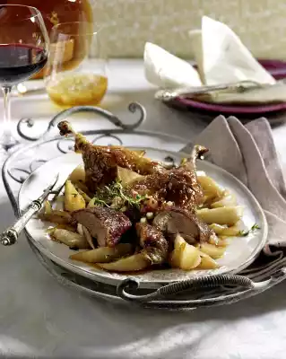 Melt 25 g butter in a saucepan. Add turnips and onions and fry while turning. Sprinkle with sugar. Let it caramelize for 5 minutes while turning. Add 3 tablespoons of cooking fat to the duck, add 5 tablespoons of cognac and cook over a low heat for 8-10 minutes.