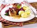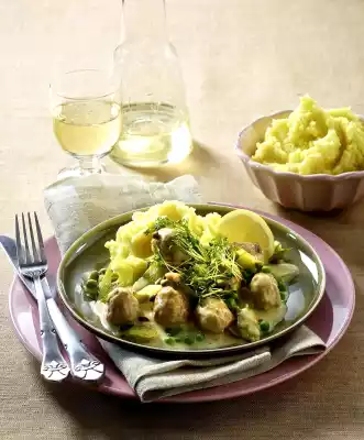 Clean, wash and cut the leek into rings. Peel and wash the potatoes, cut in half depending on size. Cook in boiling salted water for about 25 minutes. In the meantime heat 2 tablespoons of oil in a large frying pan. Press sausage meat directly from the skin as balls into the hot oil.