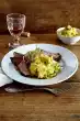 Add peas to the goulash, bring to the boil and continue to braise for about 3 minutes. Cut cress from the bed. Season goulash with salt, pepper and sugar. Arrange goulash, sprinkle with cress and pepper.