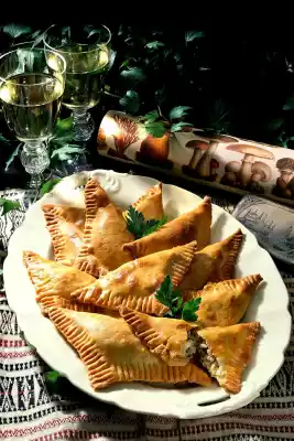 Cut into squares (10x10 cm). Put a tablespoon of filling on each square. Brush the edges with egg yolk and close the corners as a triangle. Press the edges together with a fork. Brush the dumplings with egg yolk and bake on a greased baking tray in a preheated oven (electric cooker: 200 °C/ gas: level 3) for 20-25 minutes.