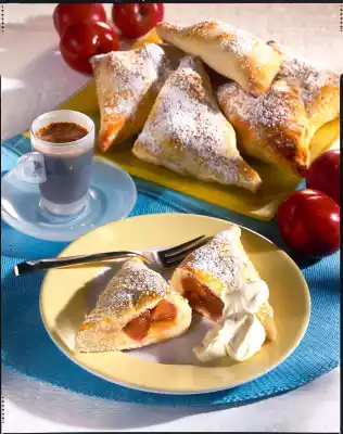 Separate the egg. Mix the egg yolks and 2 tablespoons of milk. Place 1-2 tablespoons of stewed plums in the middle of each dough. Brush the edges with the egg white. Fold the dough pieces into triangles.