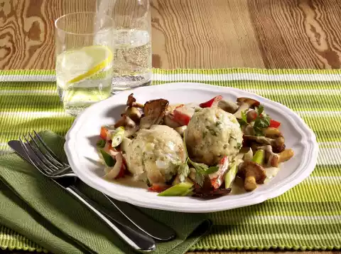 Leek onions clean, wash and cut into rings. Let dumplings simmer in boiling salt water for 10-15 minutes. Heat the oil in a pan, fry the mushrooms in it in portions and take them out. Sauté the bell peppers in the frying fat. Add spring onions and mushrooms and fry for about 1 minute, turning. Dust with flour and sauté briefly. Add cream and 250 ml water while stirring, bring to the boil, stir in broth. Let simmer for 2-3 minutes. Season to taste with salt and pepper. Remove dumplings from water, drain. Arrange dumplings with the mushroom ragout. Garnish with set aside parsley