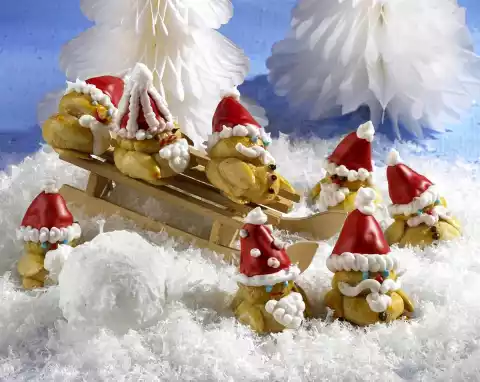 Place one of the larger balls as the torso and one smaller ball as the head on top of each, press lightly. Press 2 almond halves as arms against the torso. Place the cones as caps on the baking tray as well.